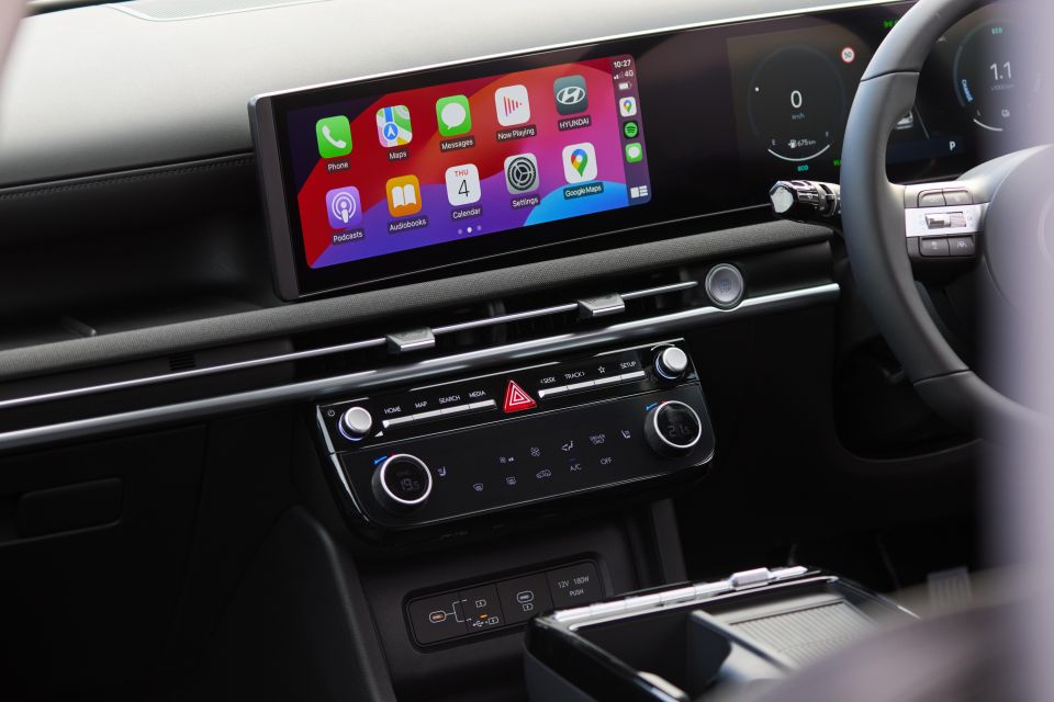 Gone is the touch-capacitive waterfall and built-in shows, and of their place is a extra fashionable and open plan design with the Hyundai-Kia twin 12.3-inch Connected Car Navigation Cockpit (ccNC) show format.