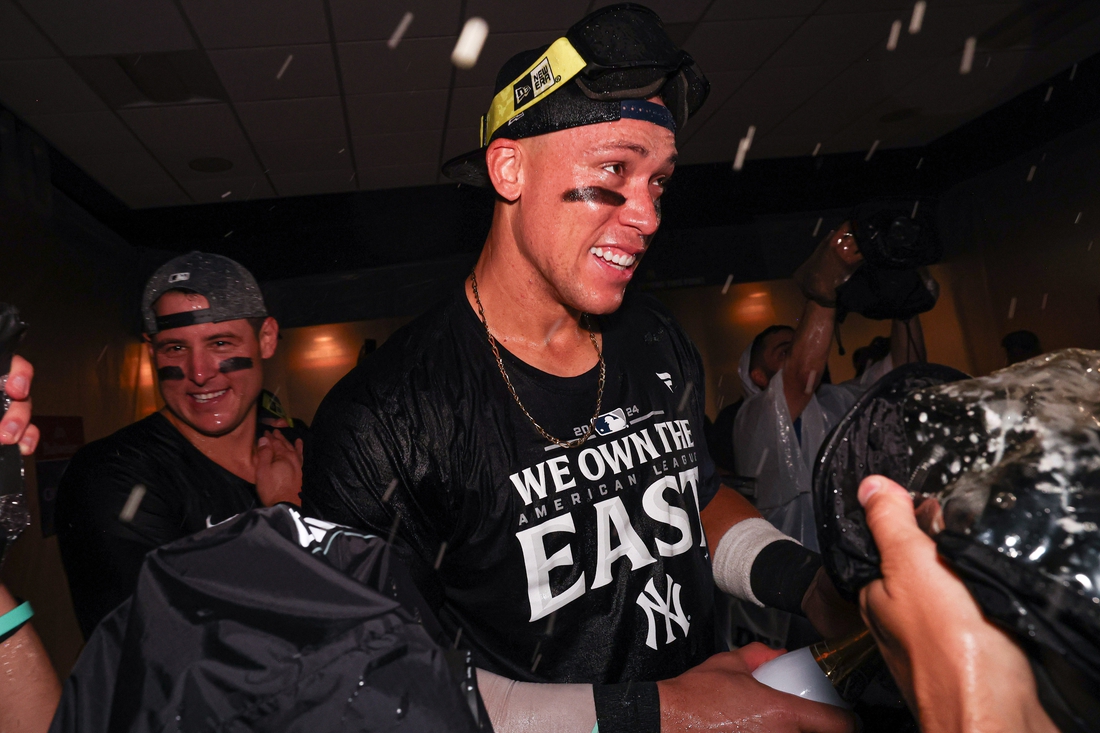 Sep 26, 2024; Bronx, New York, USA; New York Yankees middle fielder Aaron Judge (99) celebrates after defeating the Baltimore Orioles to clinch the American League East title at Yankee Stadium. Mandatory Credit: Vincent Carchietta-Imagn Images MLB roundup: Thursday