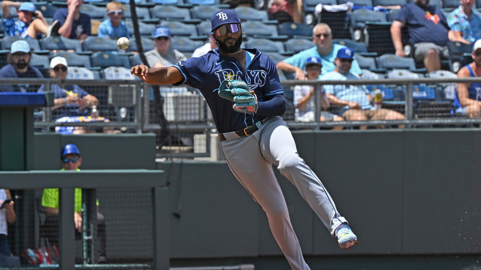 Tampa Bay Rays third baseman Junior Caminero throws to first base for an out within the fourth inning in opposition to the Kansas City Royals at Kauffman Stadium.