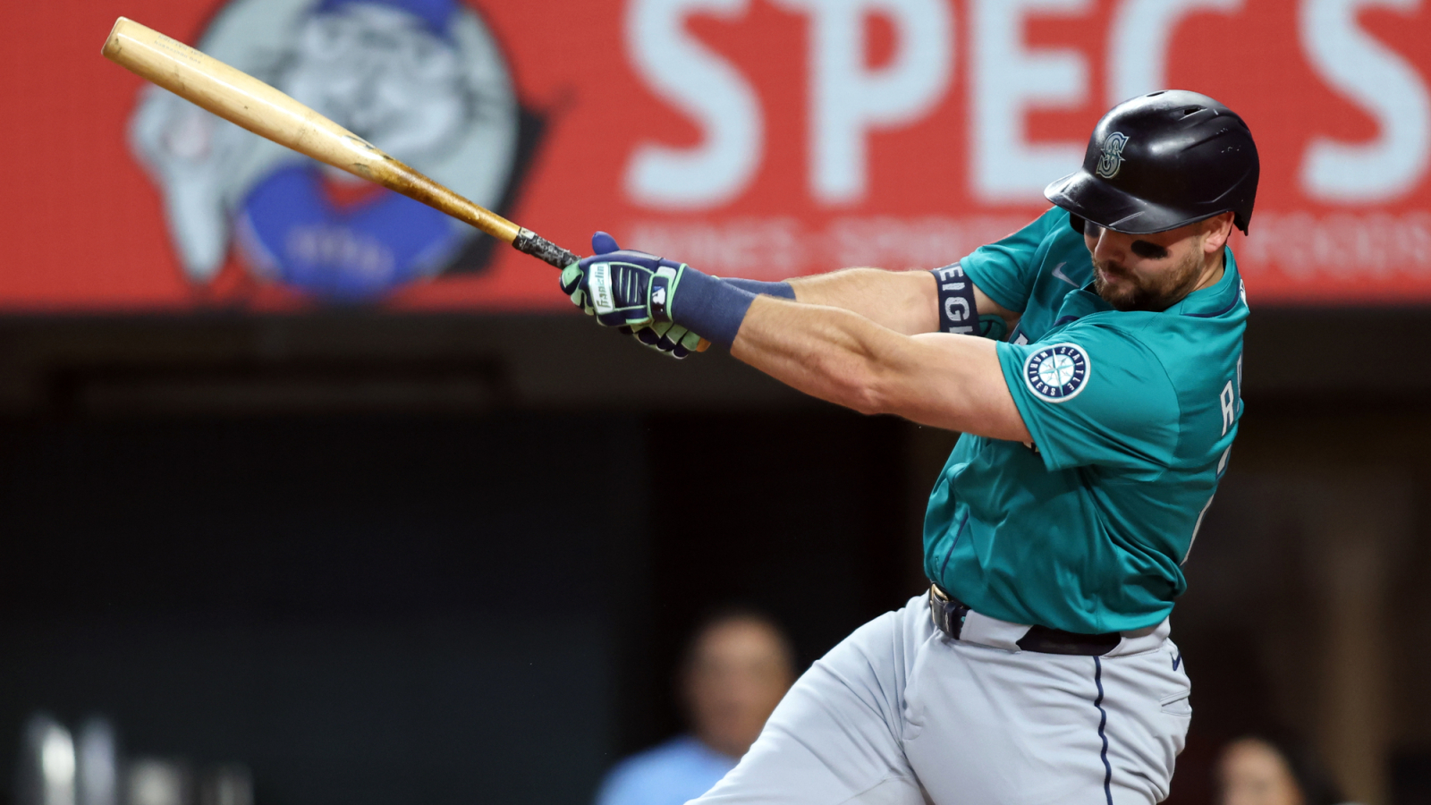 Seattle Mariners designated hitter Cal Raleigh hits a single through the first inning in opposition to the Texas Rangers at Globe Life Field.