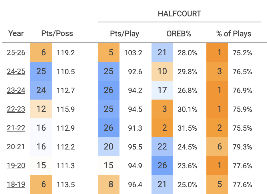 This comes into focus significantly in a halfcourt setting. Attacking in opposition to a set defence — the place gamers are already matched up with their man and never scrambling again like in transition — has been one of many Raptors’ best weaknesses lately. They’ve ranked within the backside six for 4 consecutive seasons.