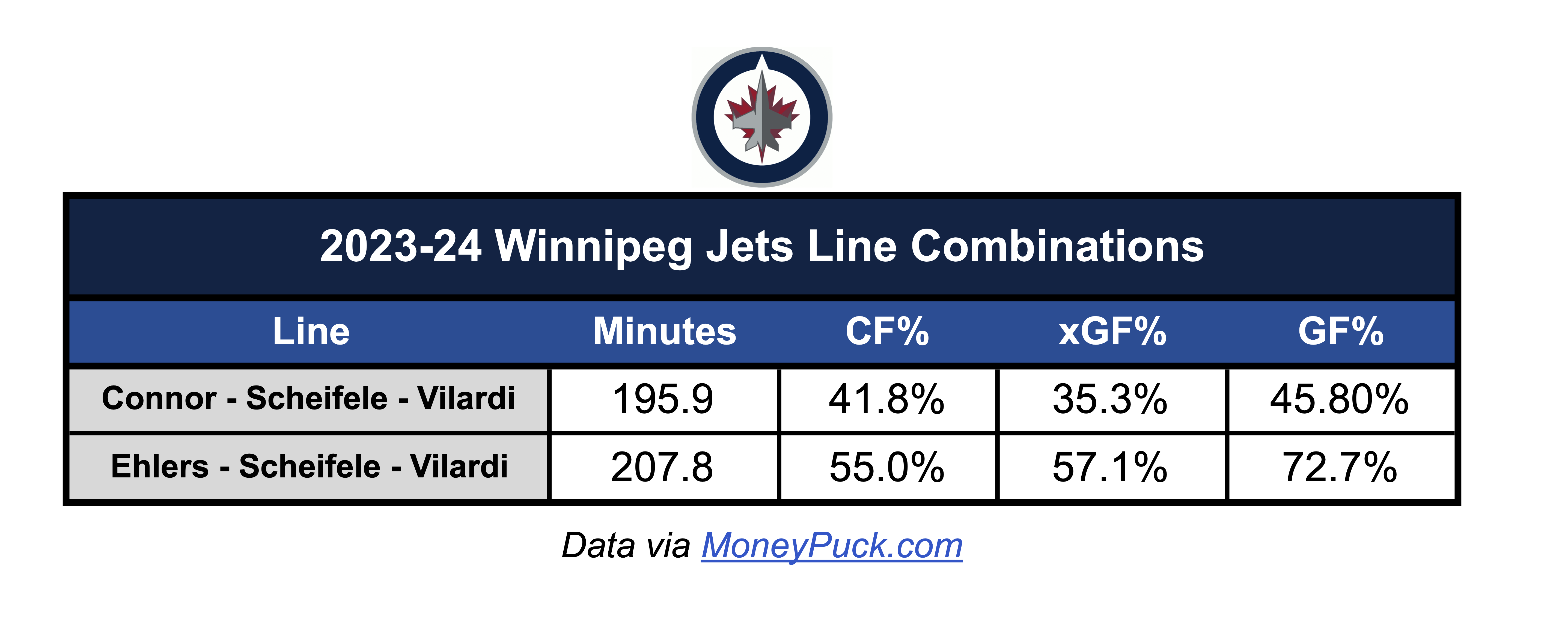 In 207.8 minutes collectively, Ehlers-Scheifele Vilardi posted a 57.1 anticipated goals-for share and the Eleventh-highest anticipated goals-for per 60 minutes of any line that performed not less than 150 minutes collectively (3.58).