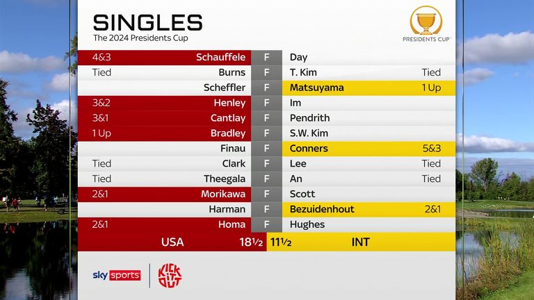 The United States gained seven-and-a-half factors within the final-day singles to finish a convincing 18.5-11.5 victory at Royal Montreal Golf Club, their largest away win in Presidents Cup historical past and the thirteenth time in 15 editions of the biennial contest they’ve claimed the trophy.