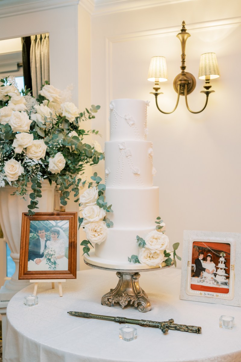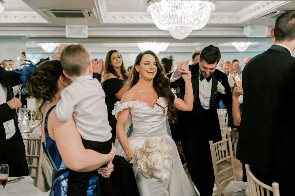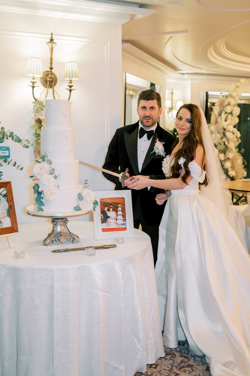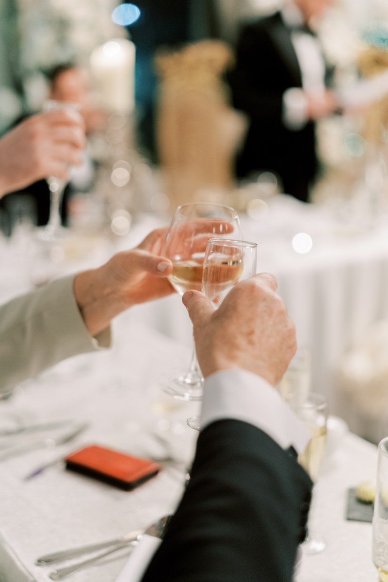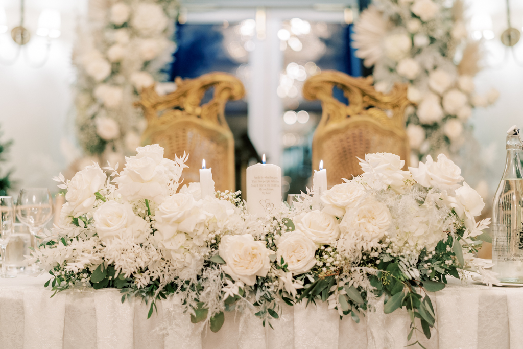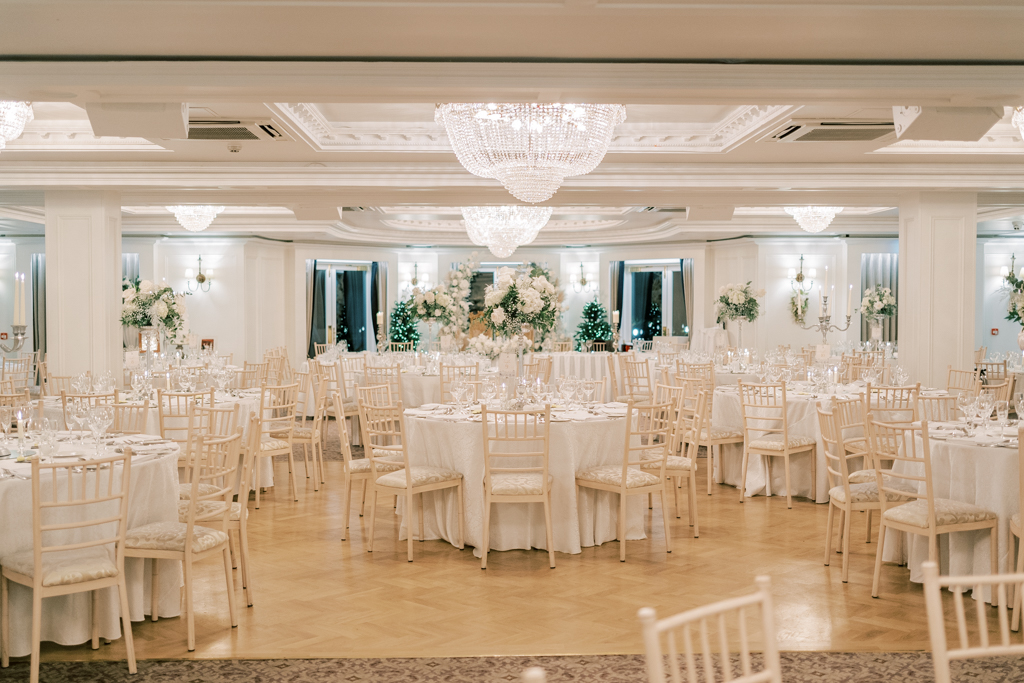 The couple’s reception within the imposing ballroom was a masterclass in all-white glamour and the dazzling chandeliers meant it was a really glowing celebration. The tablescape styling included crisp white tablecloths and cream Chiavari chairs with gold accents that includes on the desk quantity indicators and desk place settings.