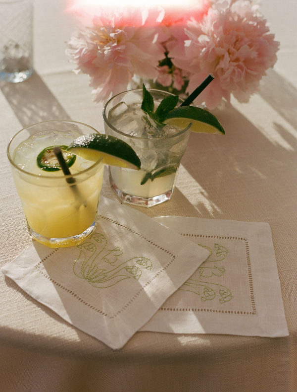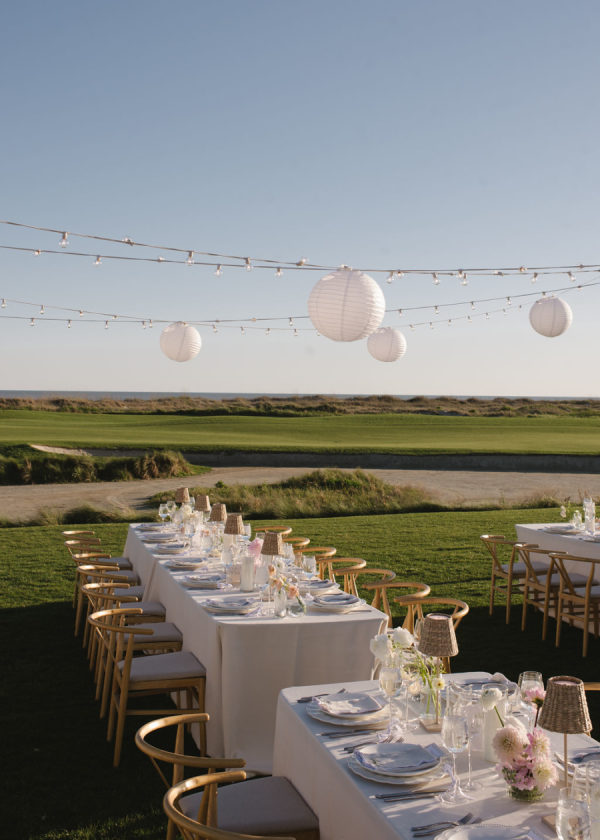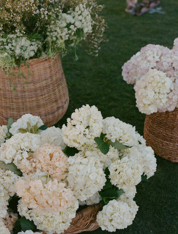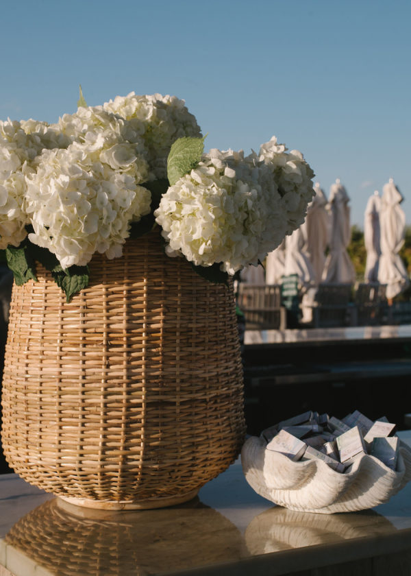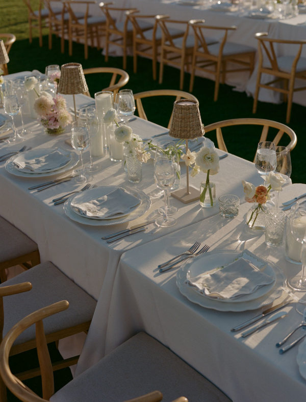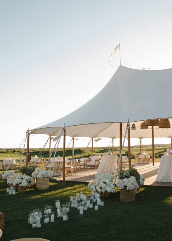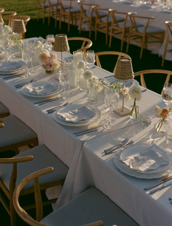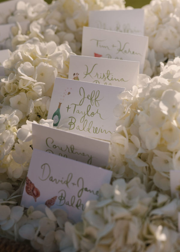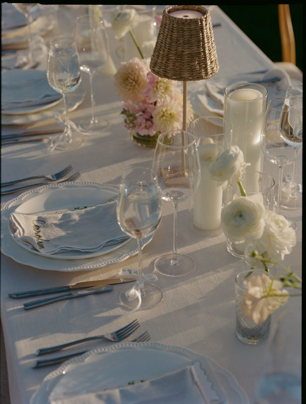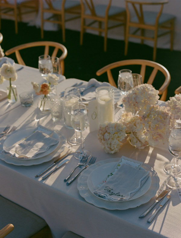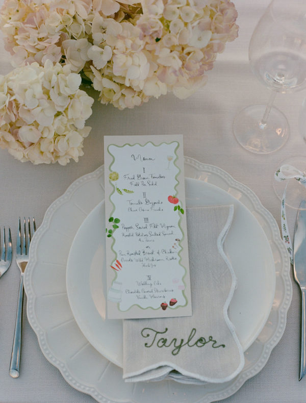 The bride and groom needed to maintain their florals basic and completely understated. Pops of pink and inexperienced had been scattered all through, with the centerpieces various from small stems to giant hydrangea installations. Candles and wicker baskets stuffed with florals adorned tabletops in addition to the doorway to the tent, creating an ideal concord between dinner and dancing. Napkins had been customized embroidered with every visitor’s title and punctiliously folded and positioned at every seat by Nicole and her workforce.