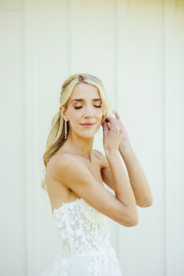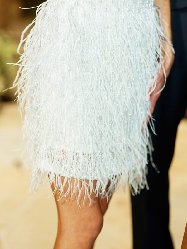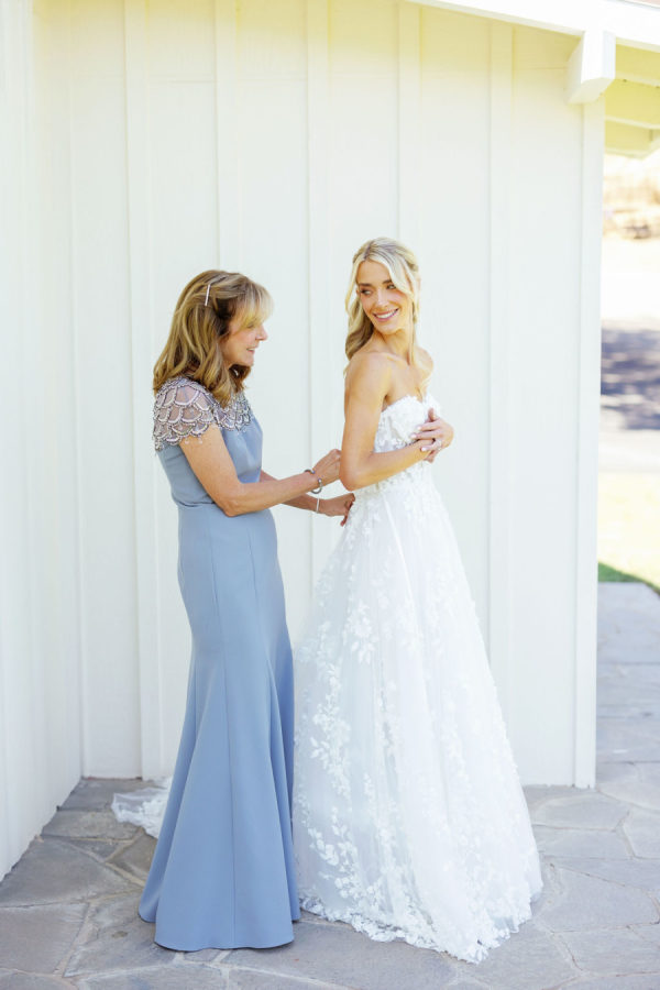 Wedding Day: Marchesa Notte “Bailey” robe, Jimmy Choo heels, SHASHI earrings, customized Etsy hair clips, heirloom diamond bracelet. I went to a number of bridal retailers in LA with my Mom, who flew in from NY, and my mother-in-law. I ended up discovering my dream costume at En Blanc Bridal.’