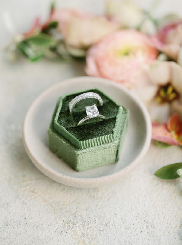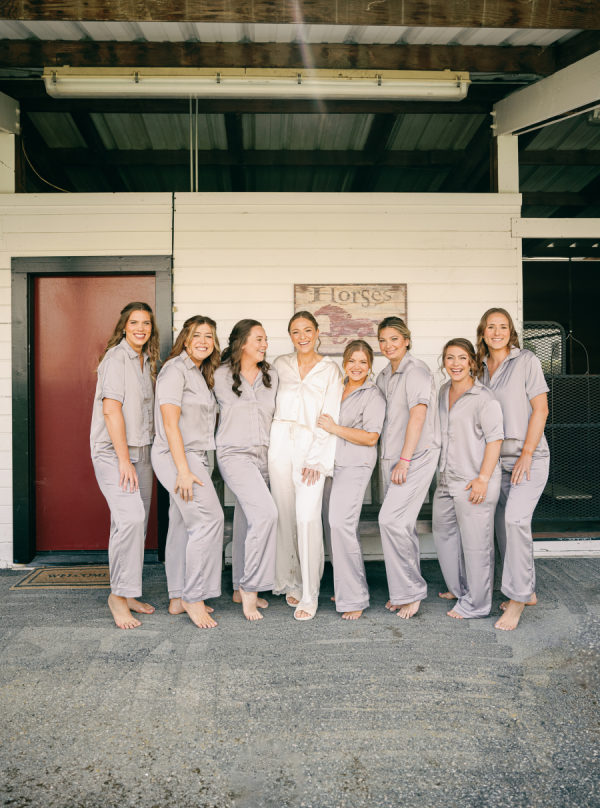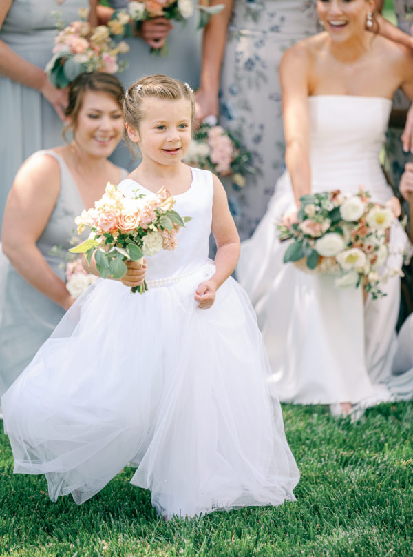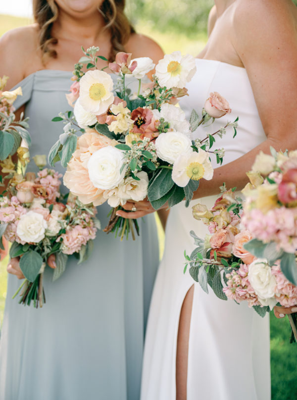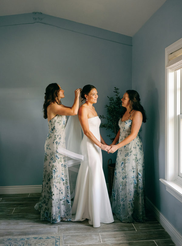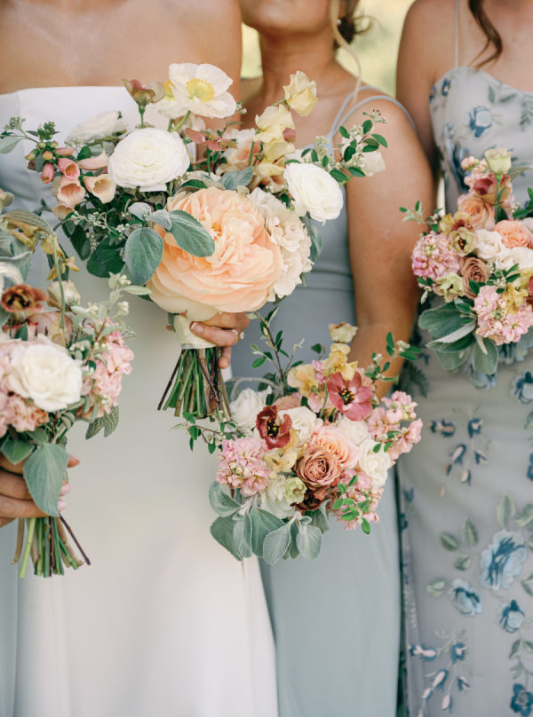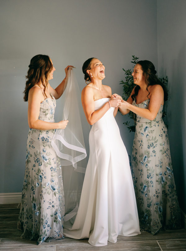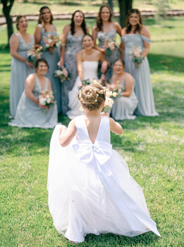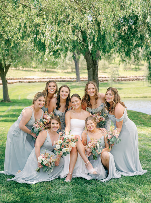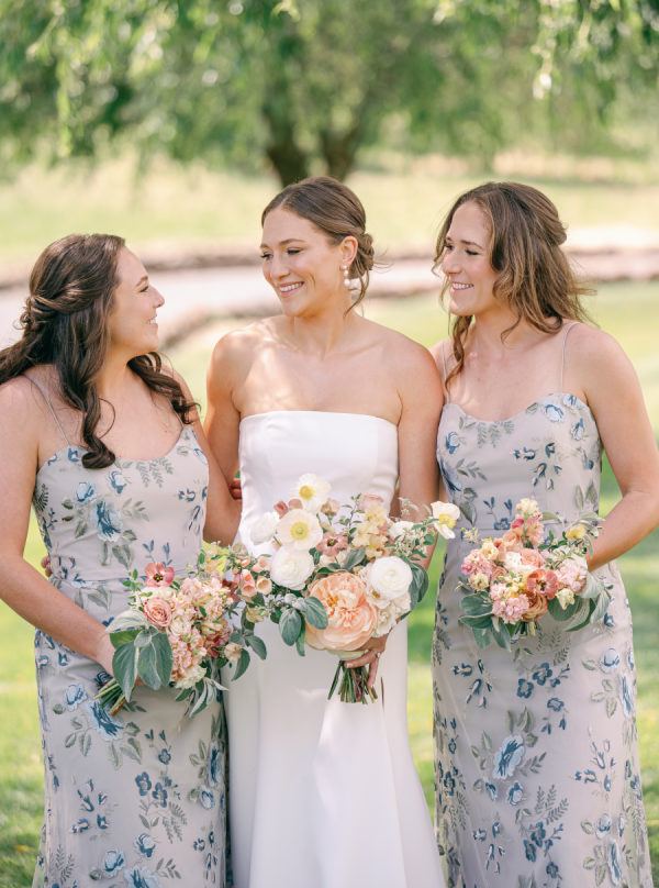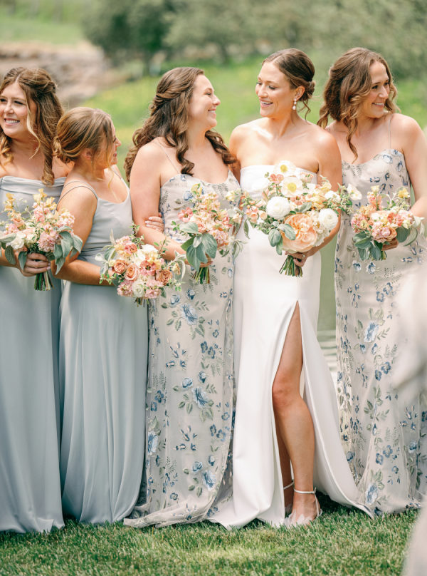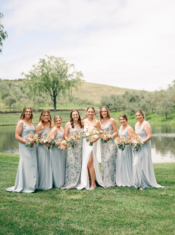 Bridesmaids wore glossy gentle sage clothes by Jenny Yoo, and the bride’s two sisters, who have been her maid of honors, had specialty floral printed clothes, additionally by Jenny Yoo, to face out!