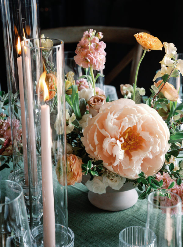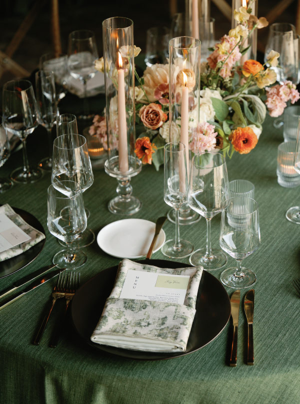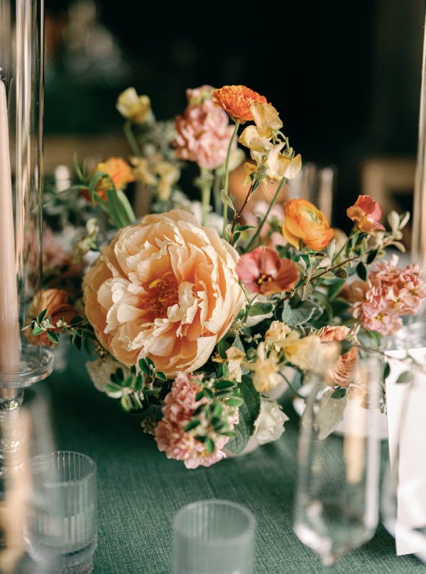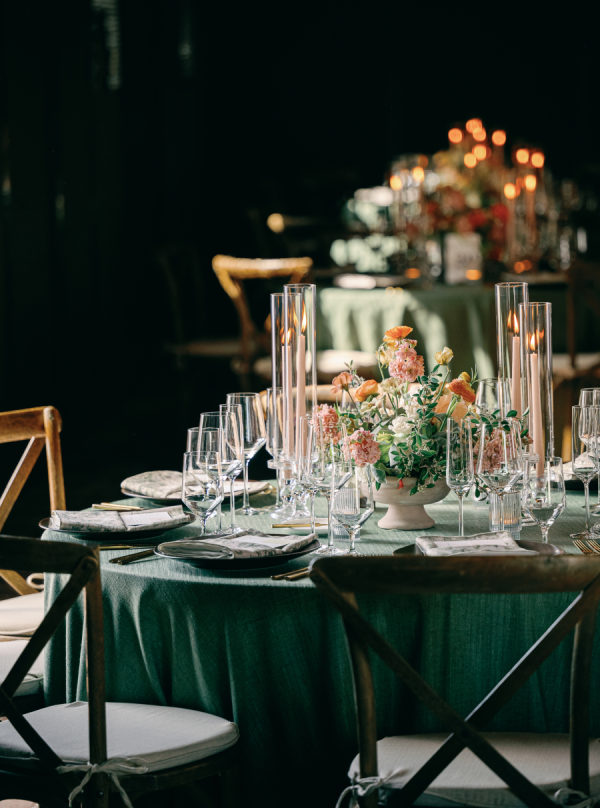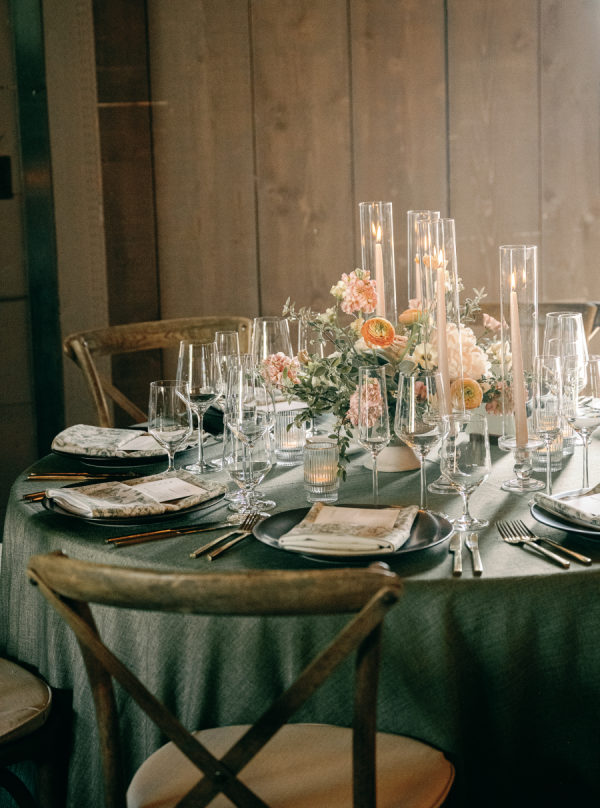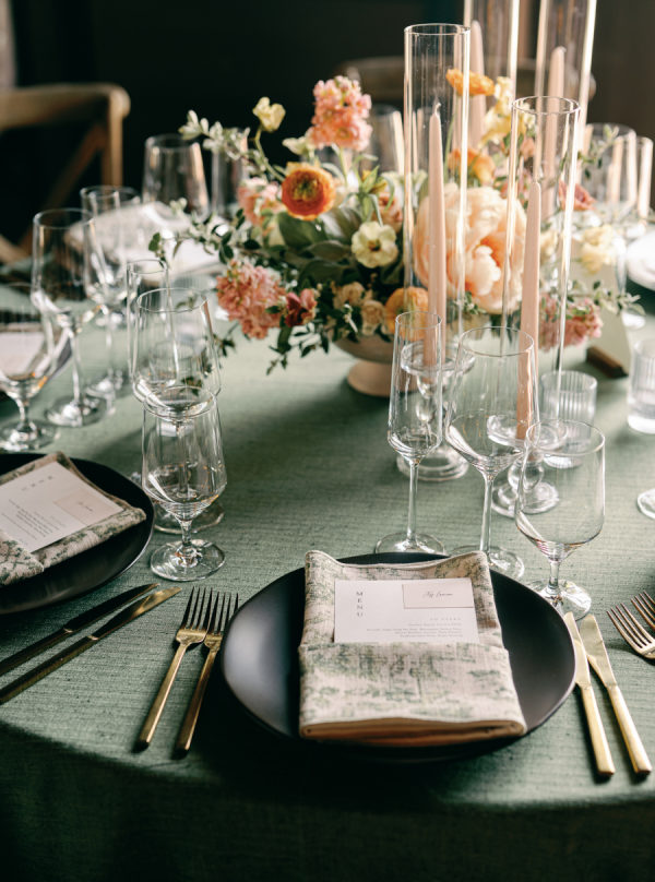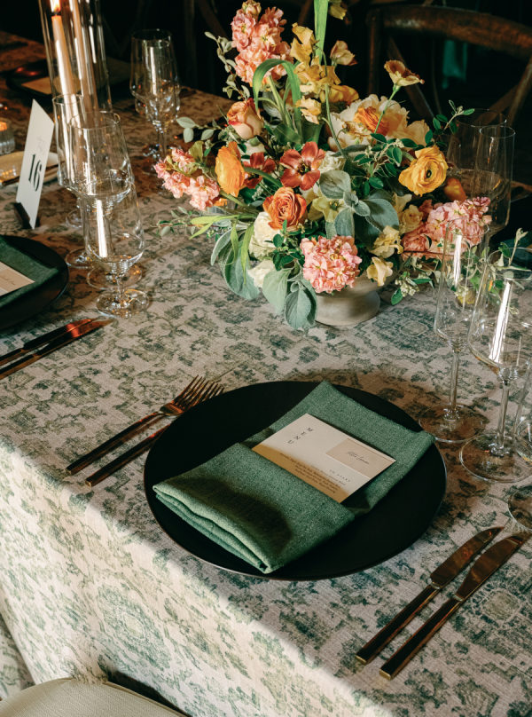 [field title=”Florals & Decor”]Inspired by the pure environment, we labored with our florist Fig and Vine to deliver a colourful array of flowers to the celebration with stunning peach peonies and vibrant Spring hues. Our eating tables performed off of richer colours with our leases, like our Forest Green linens, a enjoyable patterned head desk linen, and the wealthy deep brown stoneware charger to deliver a nod to the darkish, moody vibe of the dinner barn. We then brightened it up with daring florals and deep pink candles.[/field]