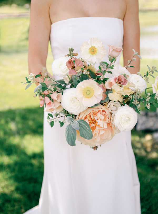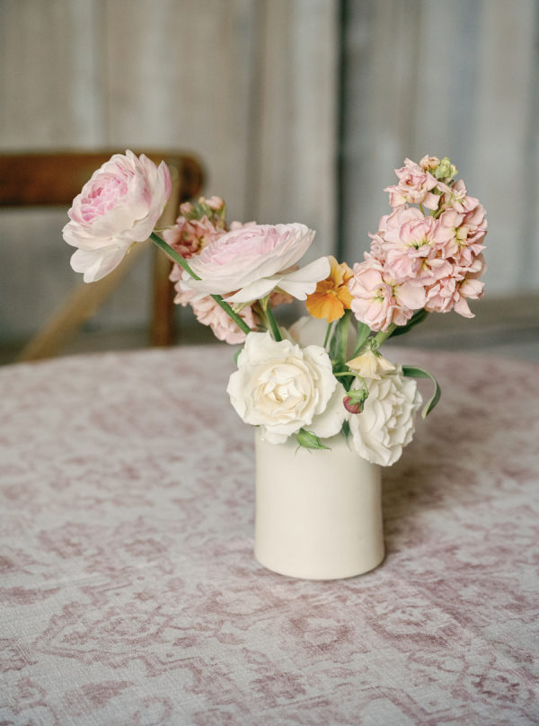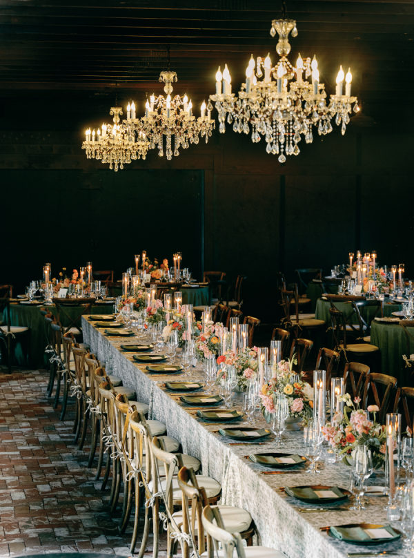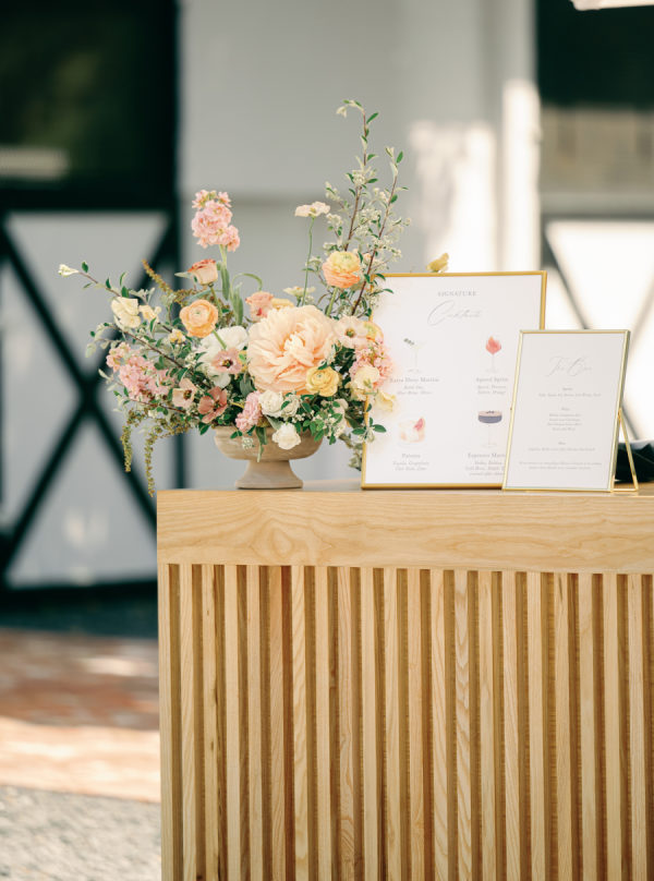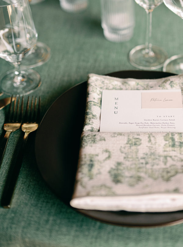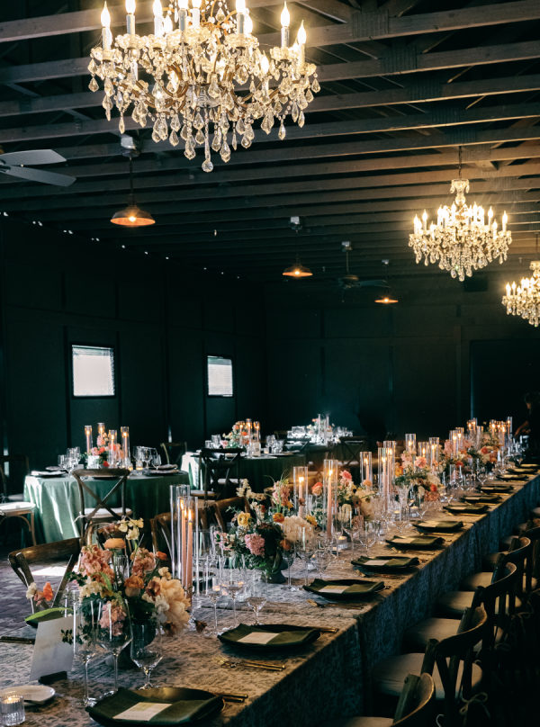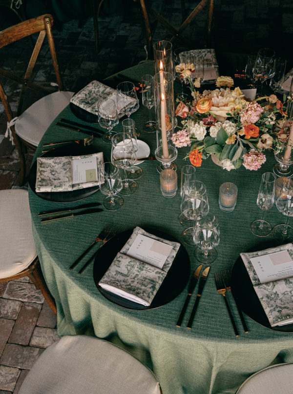 [field title=”Florals & Decor”]Inspired by the pure environment, we labored with our florist Fig and Vine to deliver a colourful array of flowers to the celebration with stunning peach peonies and vibrant Spring hues. Our eating tables performed off of richer colours with our leases, like our Forest Green linens, a enjoyable patterned head desk linen, and the wealthy deep brown stoneware charger to deliver a nod to the darkish, moody vibe of the dinner barn. We then brightened it up with daring florals and deep pink candles.[/field]