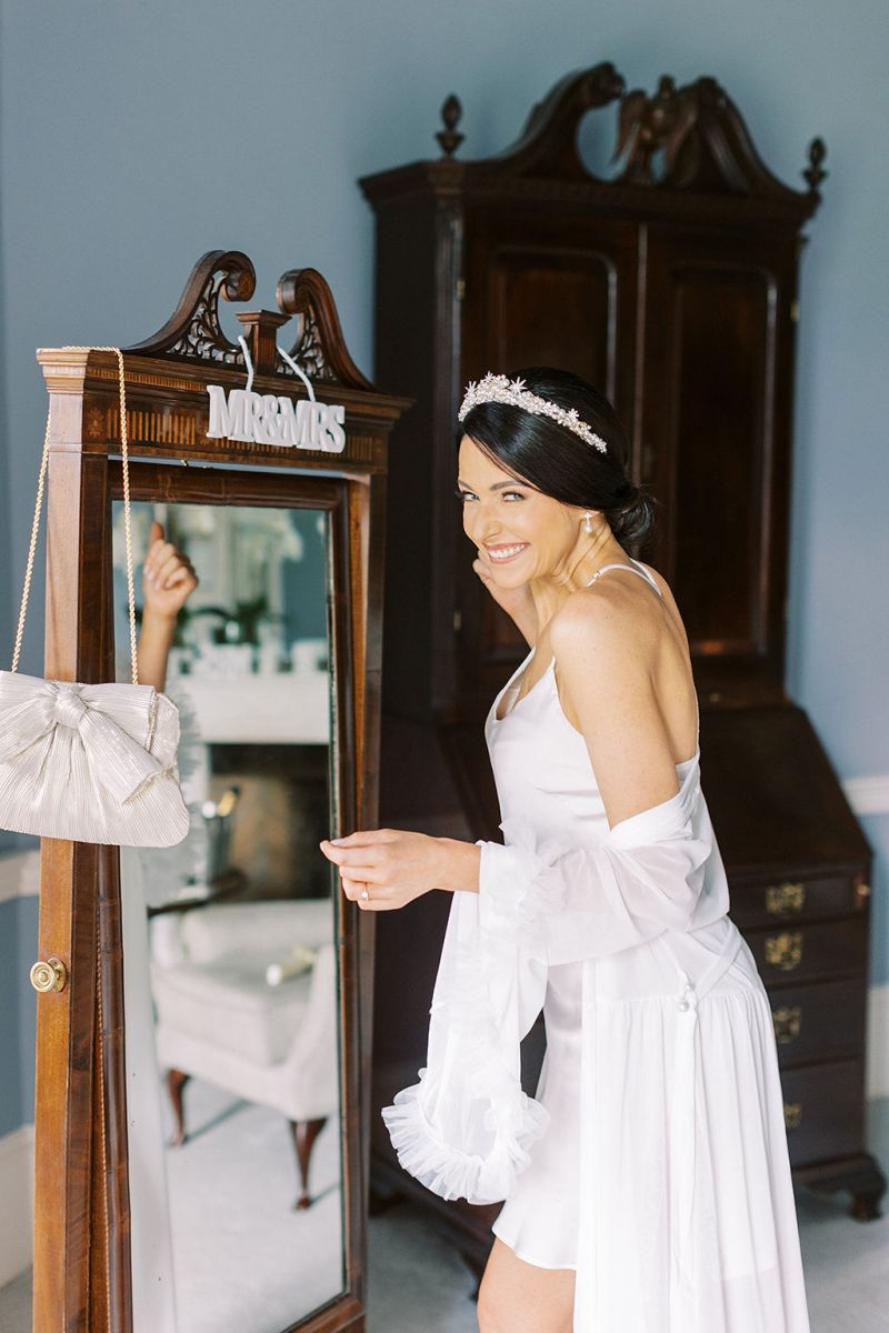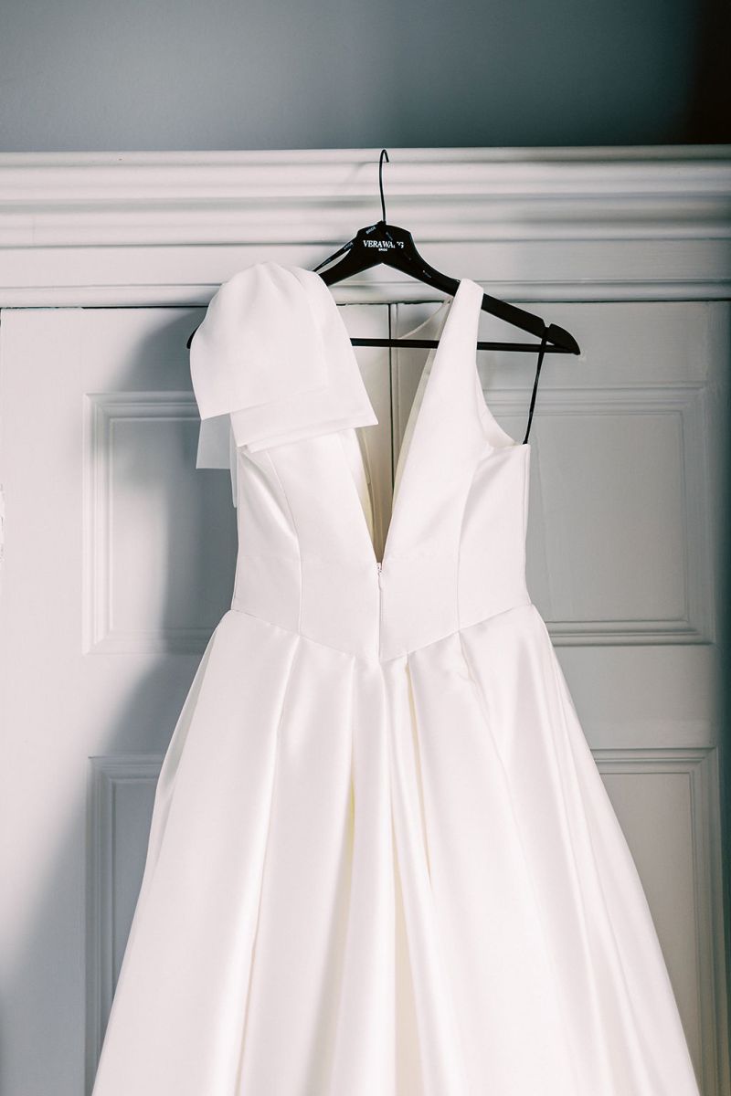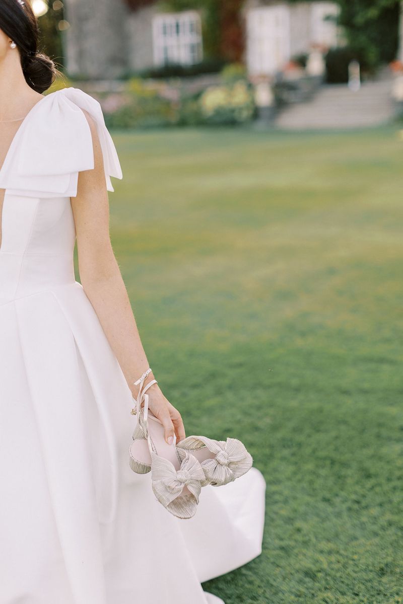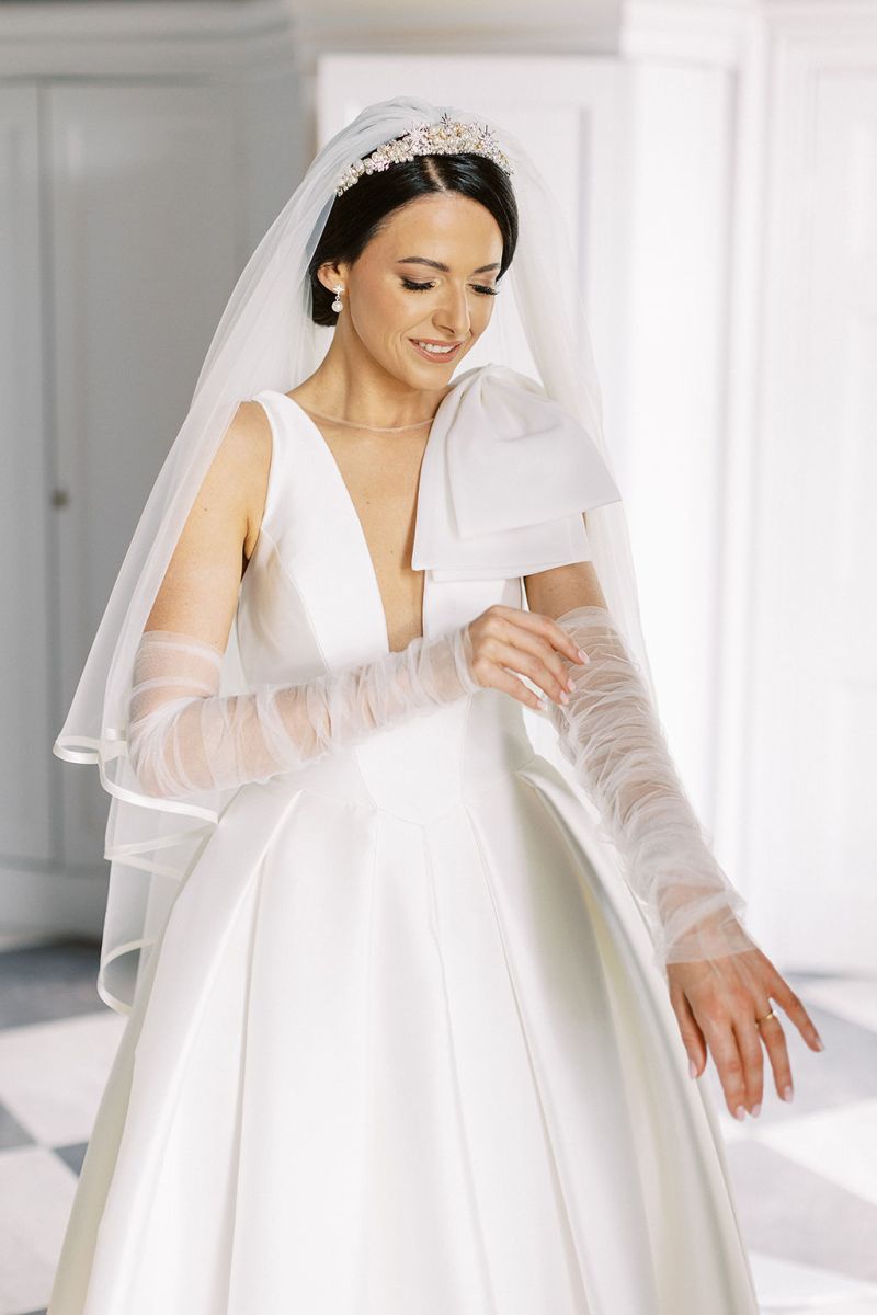 Jan’s bridal wardrobe was bursting on the seams with female and fabulous element. She wore a contemporary and romantic robe by Vera Wang with a plunge phantasm neckline and a press release bow on the neckline with tulle fingerless gloves and a glittering crystal and pearl hairband by Victoria Percival. She wore plisse bow metallic heels by Loeffler Randall with the matching bridal clutch which was a shock present her bestie introduced again from the US.