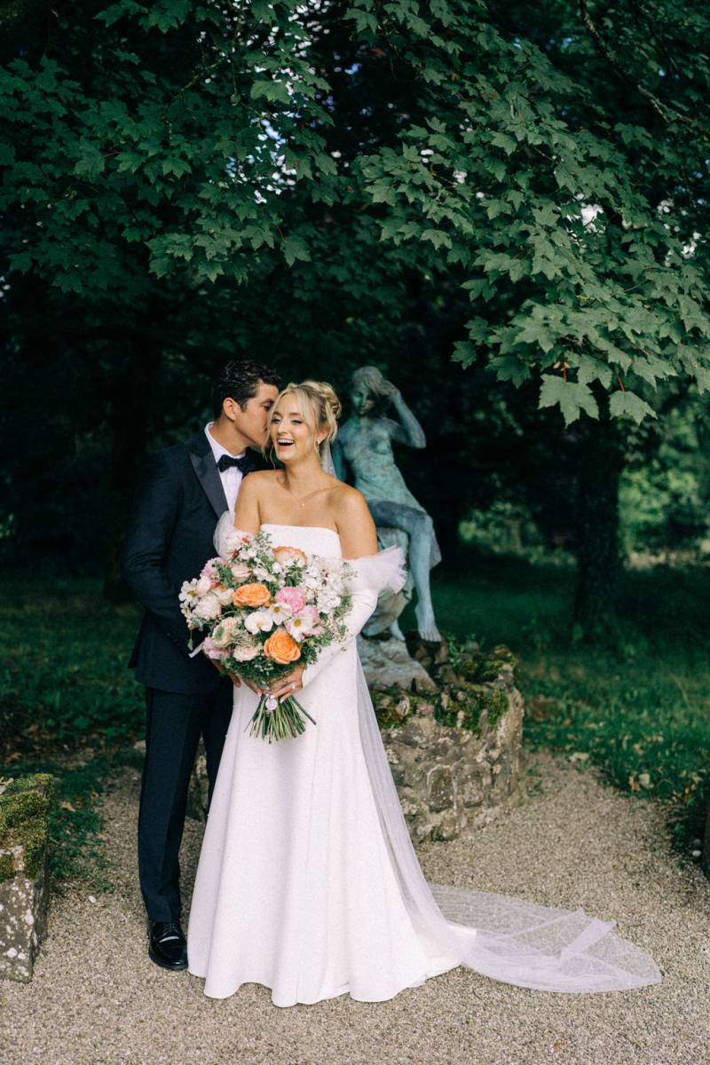 The couple imagined a “light and airy” wedding ceremony aesthetic with wildflower vibes with pastel blooms shining brilliant. “So much of the day was spent outdoors, from the ceremony to cocktail hour, to dinner intermissions and breaks, we were so lucky with the beautiful weather and even more stunning venue! We wanted to keep it whimsical but definitely loved how much of a garden feel it all had!”