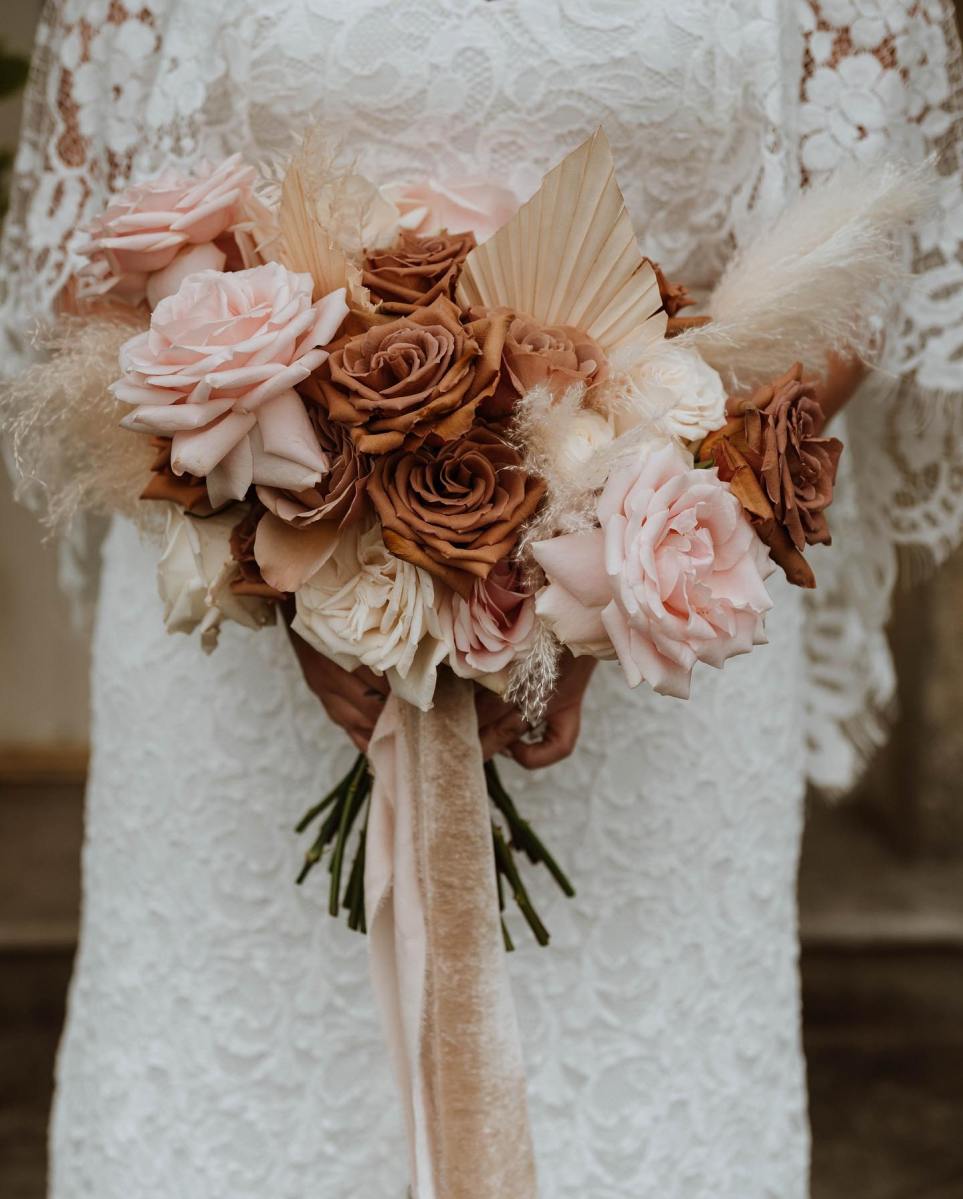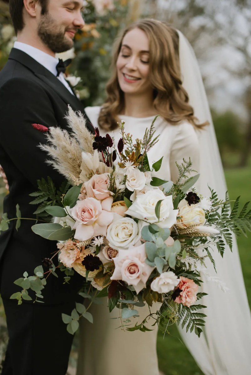 32. We love a romantic rose bouquet with a recent twist! This autumn creation by  Willow Florals options basic roses paired with fluffy pampas grass, lunaria and dried fronds.
