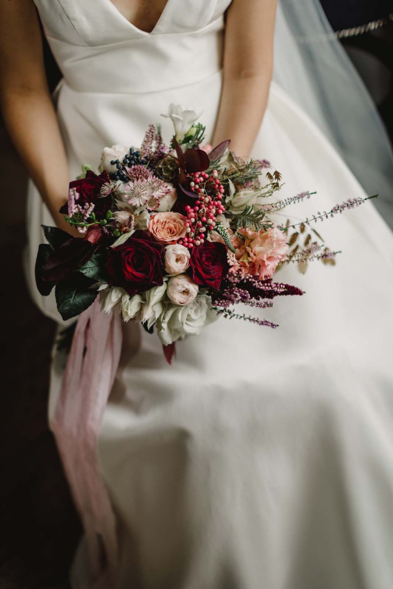 25. It’s arduous to not fall in love with Nicola’s lovely hand-tied bouquet bursting with burgundy and delicate pink autumnal flowers, tied along with velvet ribbon made by Flowers from the Secret Garden.