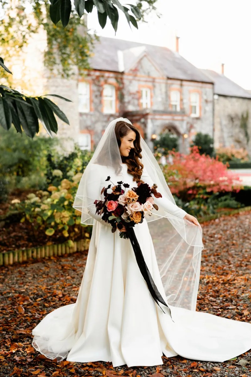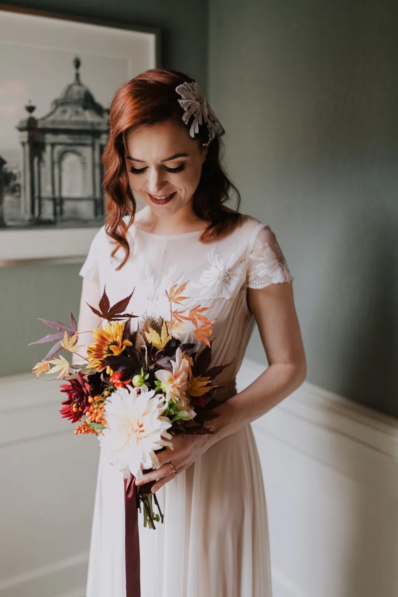 18. Mary’s gorgeous seasonal bouquet by Bríd Conroy featured a number of beautiful blooms and foliage in autumnal hues, tied along with a wealthy burgundy ribbon.