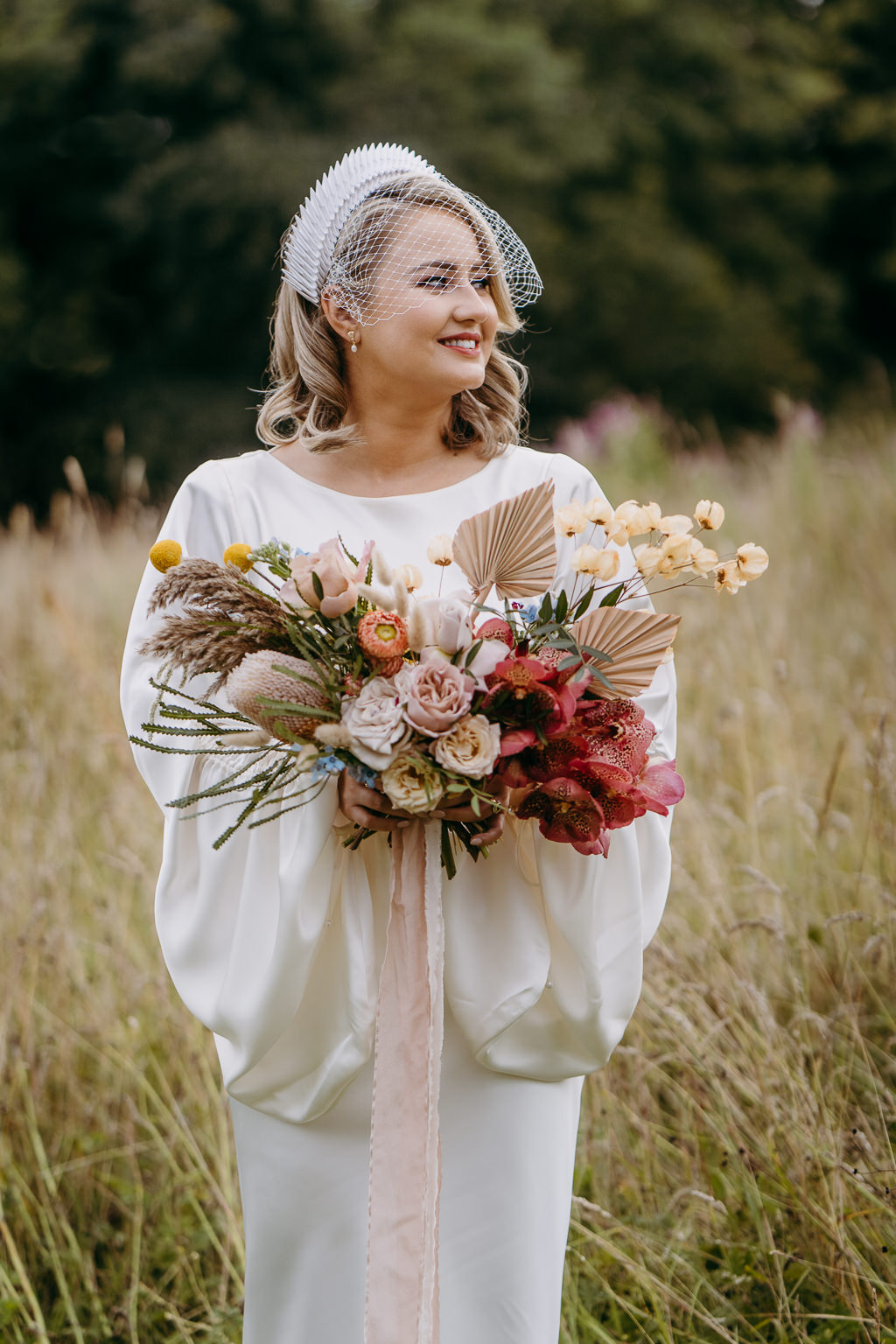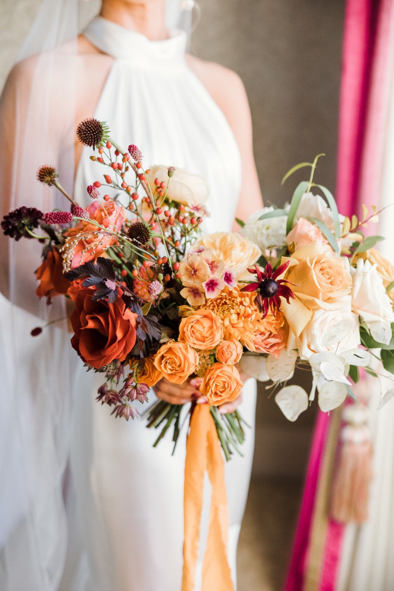 19. Alyson’s lush bouquet by The Rosehip And Berry Floral Studio featured an natural assortment of quicksand roses, chocolate cosmos, amaranth, seed pods and fall foliage.