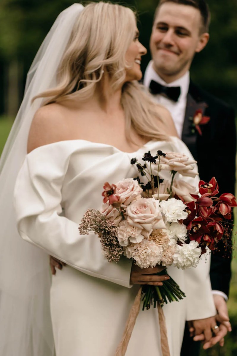 29. Autumn marriage ceremony flowers do not must be all orange and rust, simply check out Sinead’s moody fall bouquet which included blush pink roses, creamy carnations, scabiosa and purple boat orchids.