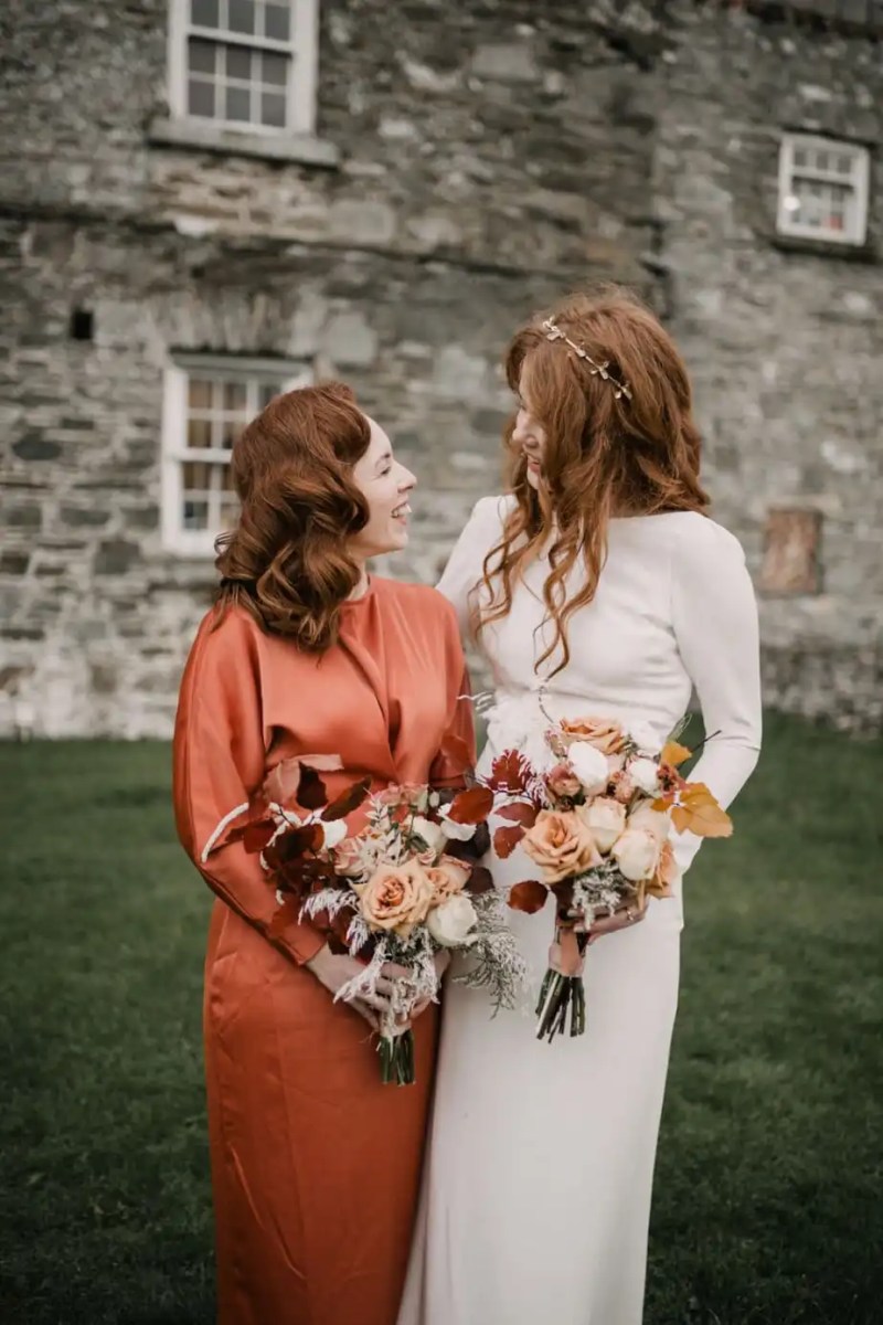 16. We’re loving this bride and bridesmaid autumn bouquet duo full of peach roses and rust-toned leaves by Moss Belfast.