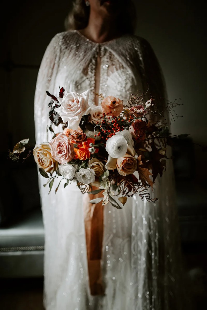 27. Roses and ranunculus in fall tones sit fairly alongside berries, autumn leaves and dried ferns in Karrena’s epic bouquet by Wallflower.