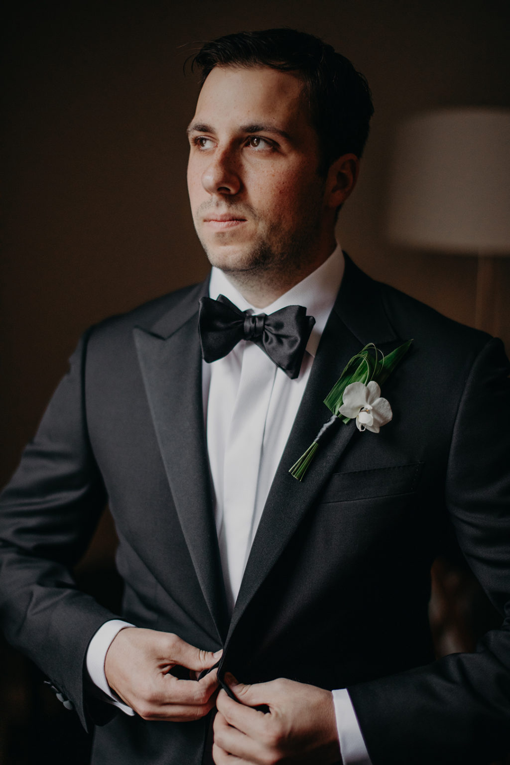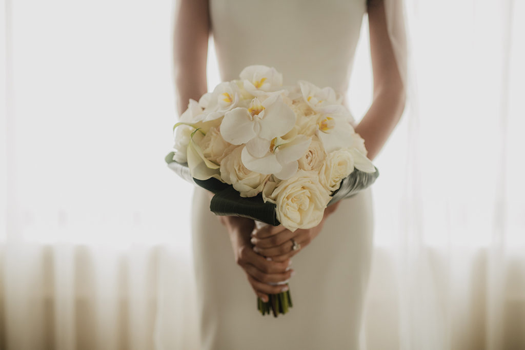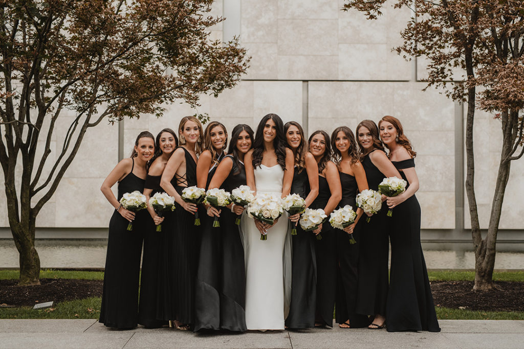 Tying in with the subtle vibes, Teddi’s stunning strapless costume and white bouquet with tropical leaves ties in so cleverly with the styling of the day, easy, fashionable, and splendid. Teddi’s bridesmaids wore stunning mix-and-match black bridesmaids robes and carried comparable white orchids and rose bouquets to the bride.