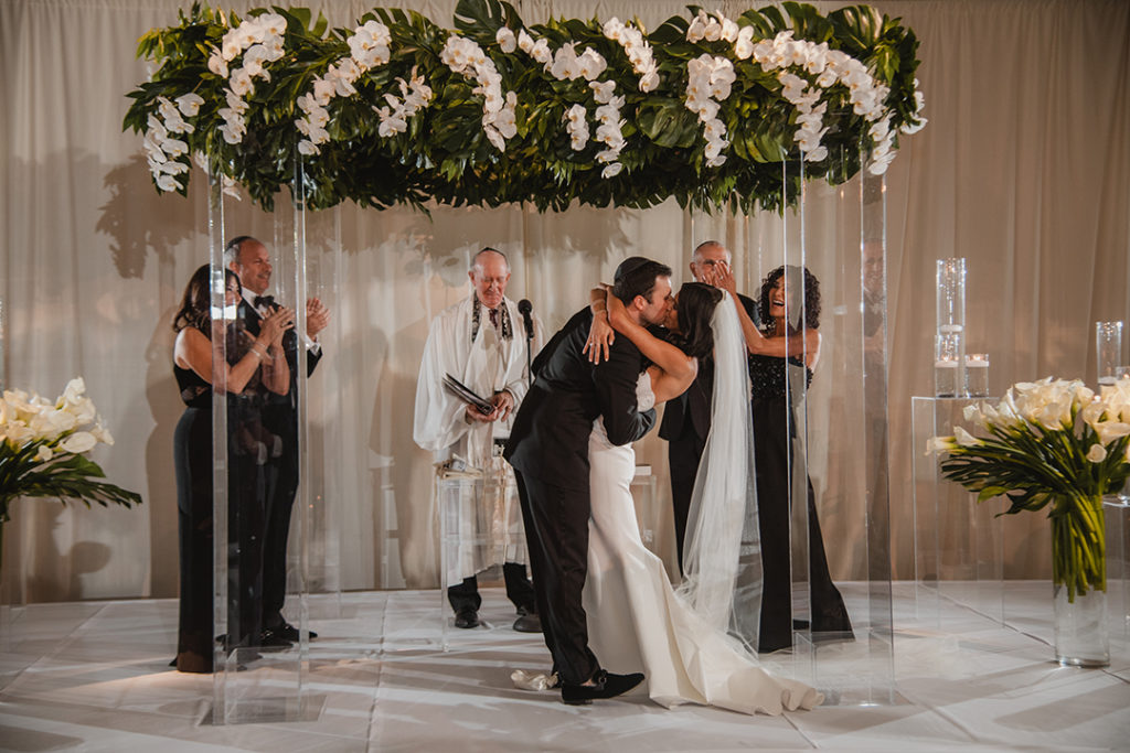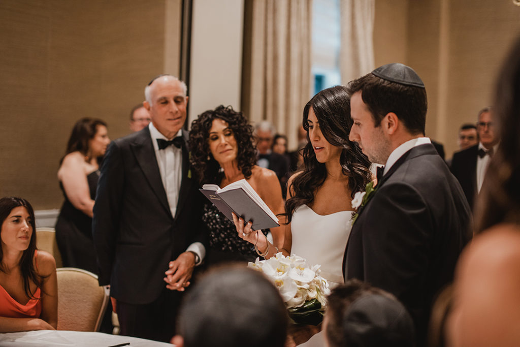 The couple mentioned their vows with their dad and mom by their sides in a Jewish ceremony.